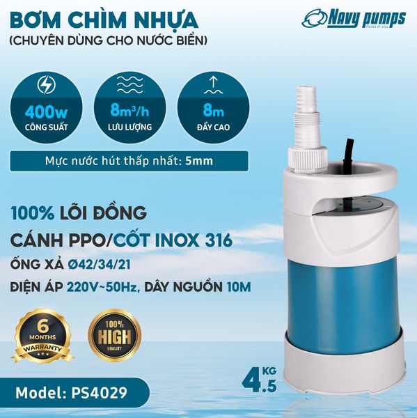 MÁY BƠM CHÌM NHỰA 400W PS4029 (CHUYÊN NƯỚC NHIỄM MẶN, HÓA CHẤT)