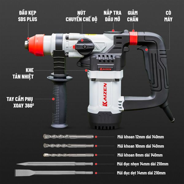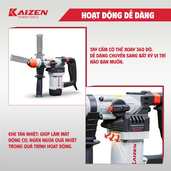 MÁY KHOAN BÚA CẦM TAY 2 CHỨC NĂNG KAIZEN KZ-RH30CT 1100W CHUYÊN KHOAN VÀ ĐỤC