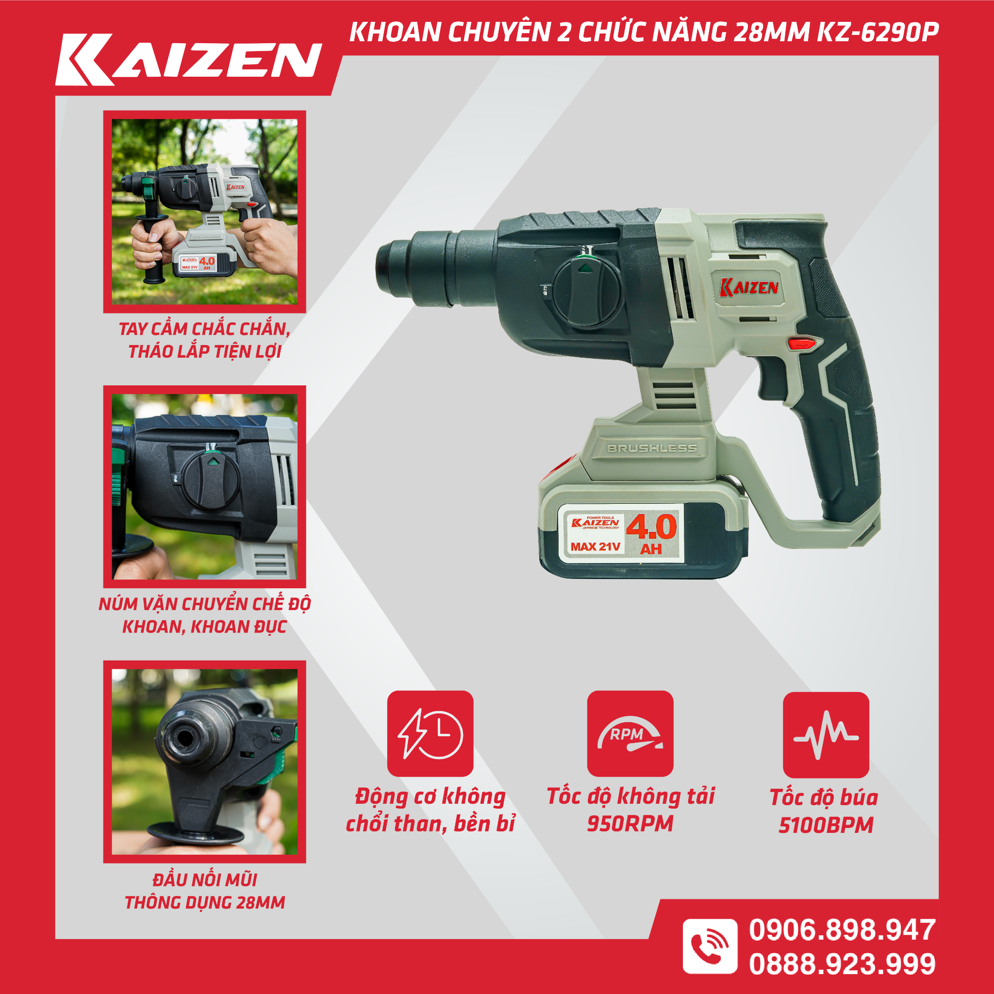 Máy khoan đục bê tông pin KZ - 6290P, 2 chức năng 28mm motor không chổi than